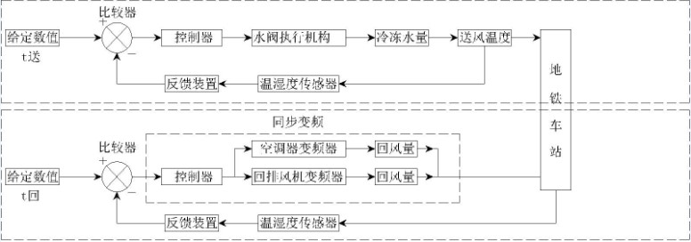 組合式空調機組送風口、回風口、新風口均設溫度傳感器T送,T回,T新,其中T送信號反饋給空調機組的比例積分調節(jié)閥,T回反饋給空調機組的電動機變頻器,空調機組的調節(jié)閥和變頻器同時調節(jié),實現(xiàn)水系統(tǒng)和風系統(tǒng)聯(lián)動控制,最大程度降低地車車站的空調運行能耗。